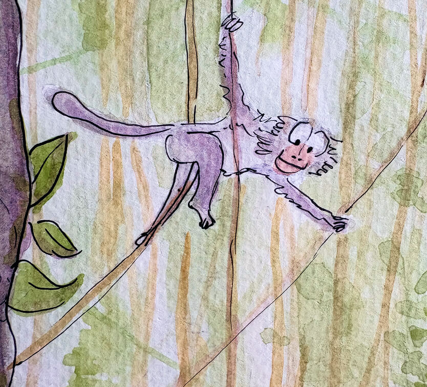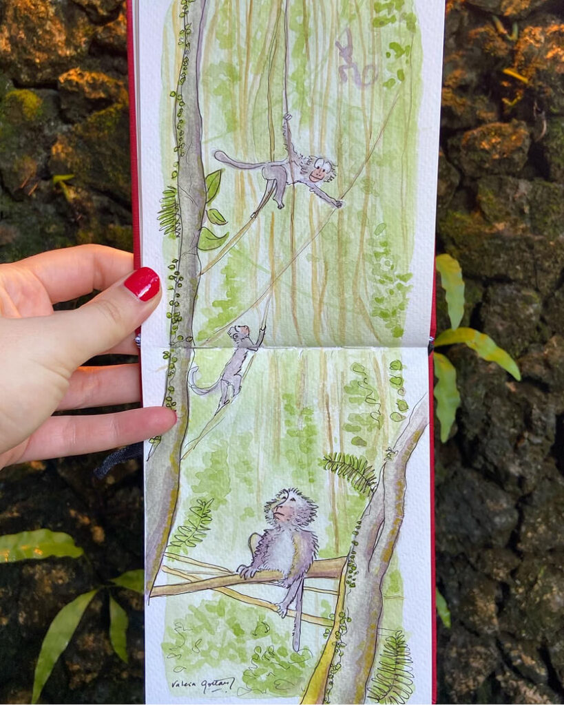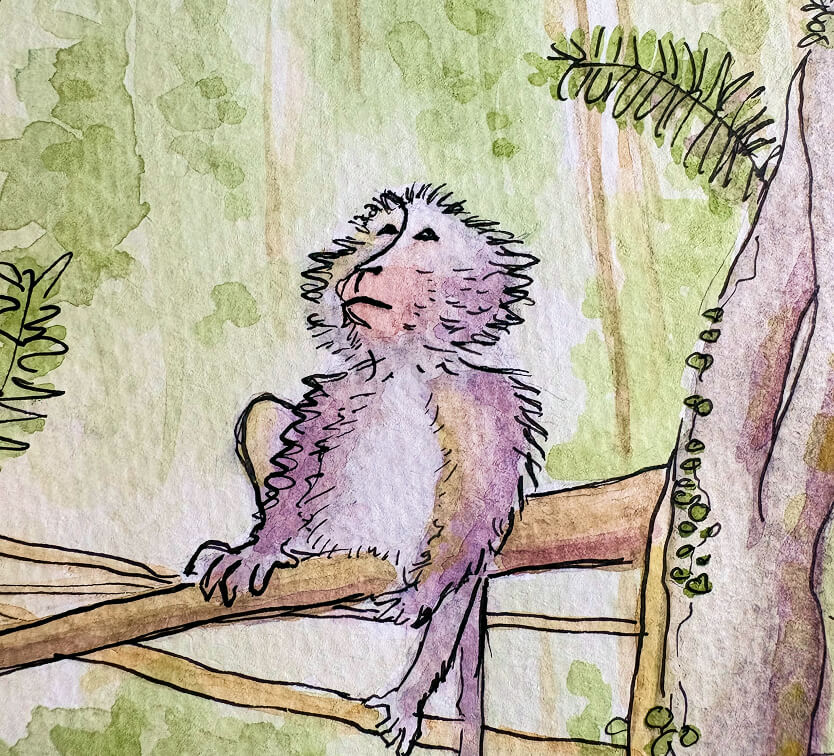 During a visit to the Sacred Monkey Forest in Bali, I was captivated by a mother monkey and her little one leaping playfully from branch to branch. I opened my sketchbook to capture the moment — not just their movement, but their connection.