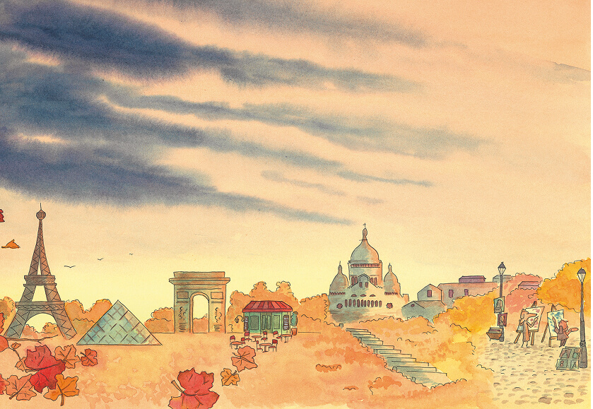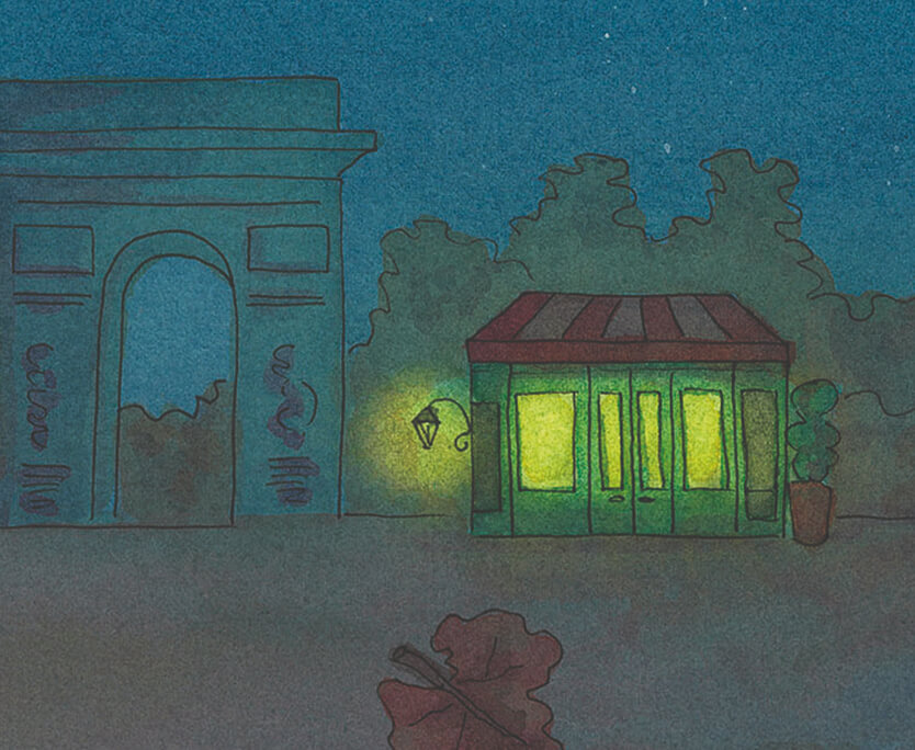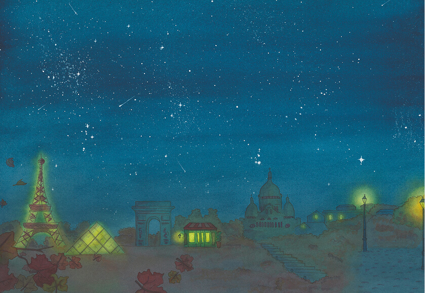 By the end of the story, Paris returns in a night version of the same scene, now bathed in deep navy blues and golden lights. The cafés glow, the Eiffel Tower sparkles, and stars scatter across the sky. Darkness no longer feels threatening; it has become familiar and serene.