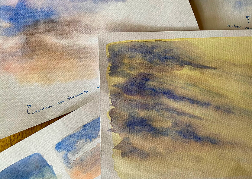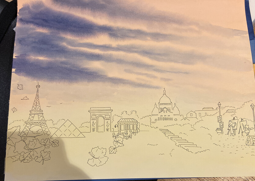 To convey that transition, I practiced painting expressive clouds that balance beauty and tension, experimenting with purples, ambers, and soft yellows to find the right emotional temperature. Together, the two images trace the story’s full arc, from arrival to farewell, from fear to confidence.