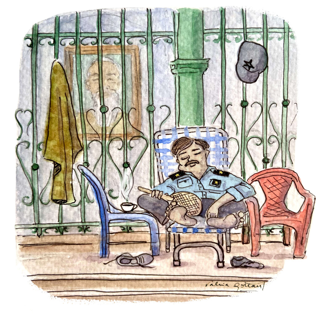 The tiles were a burning stove below his feet. The humidity was the lid that covered him from above. Even the gaze of Ho Chi Minh couldn’t stop him. The security guard at the post office floated in his fifth dream while the honks tucked him in, and his coffee cooled down on the blue plastic chair. ✉️🏤👮♂️💤 ☕️